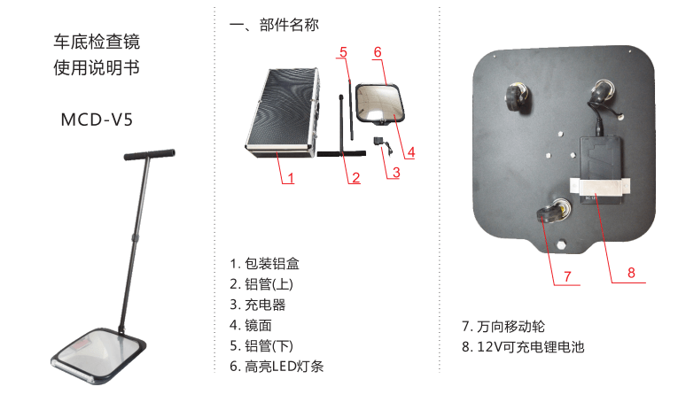 以MCD-V5車底檢查鏡為例,首先,車底檢查鏡分七個(gè)部件,分別的名稱為: